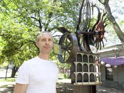 MONTREAL – After dark, I’m sitting beside the railway tracks, drinking wine out of a coffee cup, wondering where the mosquitoes are. Half a dozen people mill around a crackling fire, mounted on a milk drum, while Augie, 11, and his sister, Tallulah, 14, sitting at a table, work their way through some snacks. A thin, angular guy with bristly grey hair, our host, is waving a flashlight. I call him over, take a roll of bills from my pocket and stick them into the beam. His eyes light up. Last payment on the fish, I explain. “What? You still owe me? Hey, money’s always handy when you’ve got kids. Comes in, goes right out again.” That’s how sculptor Glen LeMesurier does business. Two years ago he offered to loan us a piece for our front yard. Visiting his studio, my husband and I decided we needed to own Poisson Jurassic, an undulating fish skeleton on a rotating pedestal, made from chunks of chains once used on mammoth long-haul trucks. Finally, it’s paid for. Irrepressibly intense, Glen LeMesurier is part of a rapidly dwindling variety of artist: hard-working, driven even, yet not a careerist. His greatest victories involve talking politicians into letting him treat various empty corners of the city as his showroom. Consequently, he has more pieces in public spaces than any other sculptor in Montreal, most of them “on loan from the artist,” including a few that went up when nobody was looking. Using elemental and recycled materials; scrap, bolts, wheels, springs, pipes, he cuts, welds and polishes, creating sculptures that capture the spirit of purposeful function in imaginative ways. Brave talismans of a crumbling time and place, built to rust, they do. Of 102 works, about half are private purchases. Others can be found in front of the Cirque du Soleil HQ (a commission), at Carré Cabot near the Atwater métro. Days later, we’re back in his private sculpture garden, a strip between the railway tracks and the Van Horne Terminal Iron Works, where he has lived and worked for 14 years. Squirrels nibble carrots hanging from a feeder in one of the many trees he planted. He serves honey from his private hive of imported Italian bees. The eternally optimistic man of action is in a reflective mood. “My vision for Montreal is sometimes so powerful, it’s overwhelming,” he says. “This city could be amazing. Look at the sculptures brought here for Expo 67. Montreal is nowhere near it’s potential for beauty.” In 2005, he won a Conseil des arts grant to see the work of Expo 67 masters in Europe, the U.S. and Canada, including Niki de Saint Phalle, Bernard Luginbühl and Jean Tinguely . He was impressed by the iron work of Jujol in Barcelona, who worked with the Catalan architect Gaudi. Travel exposed Montreal’s potential, but also clarified reality. “The only person with any kind of vision and clout here is Phyllis Lambert,” he says. “I dream of having the impact she does with the CCA.” His studio is full of gems that would enhance the aesthetic of any living room, but he hankers to go big. “Every idea I get these days needs to be on a much larger scale.” Being allowed to create for Montreal is not enough any more. He would like to create a four-season sculpture garden in the countryside, a permanent exhibition people might actually pay to see. He’s even found the perfect location. But how does an inveterate noncareerist change the way he relates to the world without becoming somebody else? In Glen’s case, the beginning began with heartbreak – a horrific experience with a woman last winter. In the worst of it, close friends kept an eye on him 24/7. As the cloud lifted, he began to question his future both as a rogue public artist and as a woman-adoring, lumpstaking 51-year-old single guy: “Why can’t the universe throw an artist at me, a woman who can make stuff happen? “I gave this a lot of thought, and figured out that when I meet somebody, I always look at the body first, you know, glance down, get hooked. “Months later I wake up and realize she’s a wing nut. So I decided (his thumbs and index fingers form a square), the next one, I’m going to look in the eye, get her talking and find out what she’s thinking. If she’s got something going on in her life, then – only then – do I let myself look down.” So he did. That’s how he found Rouge Lefebvre, who is not only an accomplished artist but can prepare delicious meals on an open fire and is also beautiful. His showroom has never looked so professional. His plans have never been so concrete. A member of the new group of Friday Voice columnists, Marianne writes the Micro Montreal column which profiles people and places in our city. A novelist, playwright and critic, Marianne is publisher of The Rover, an online arts magazine found at http://www.roverarts.com. E-mail: marianne@roverarts.com © Copyright (c) The Montreal Gazette Read more here. Nightlife magazine